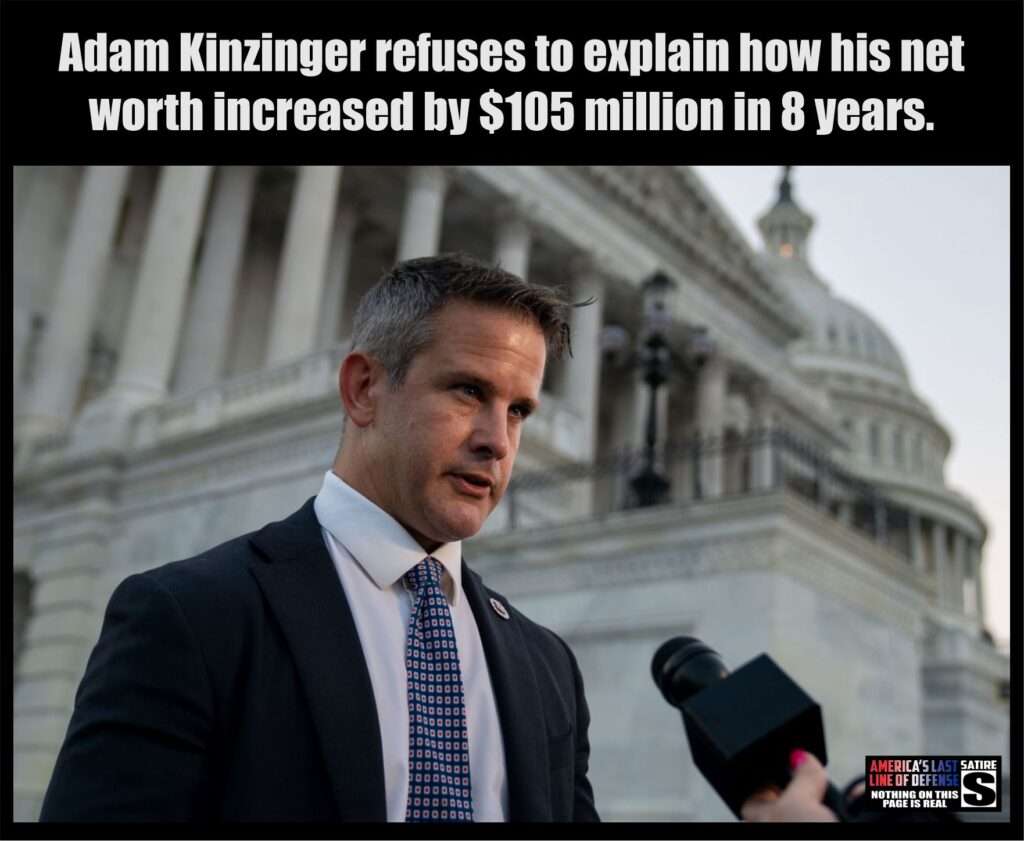 Washington, D.C. – Former Congressman Adam Kinzinger, a vocal advocate for transparency and accountability, is suddenly less enthusiastic about those principles after reporters began asking how his net worth mysteriously skyrocketed by $108 million in just eight years.