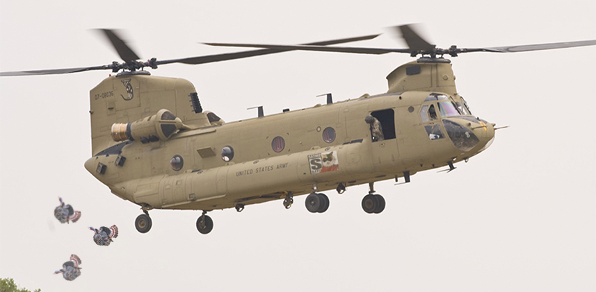 As the noon hour approached, the cargo doors on the Chinook opened. The crowd went into a frenzy.  At the strike for 12 pm, a crew member on board the helicopter opened the cage doors.