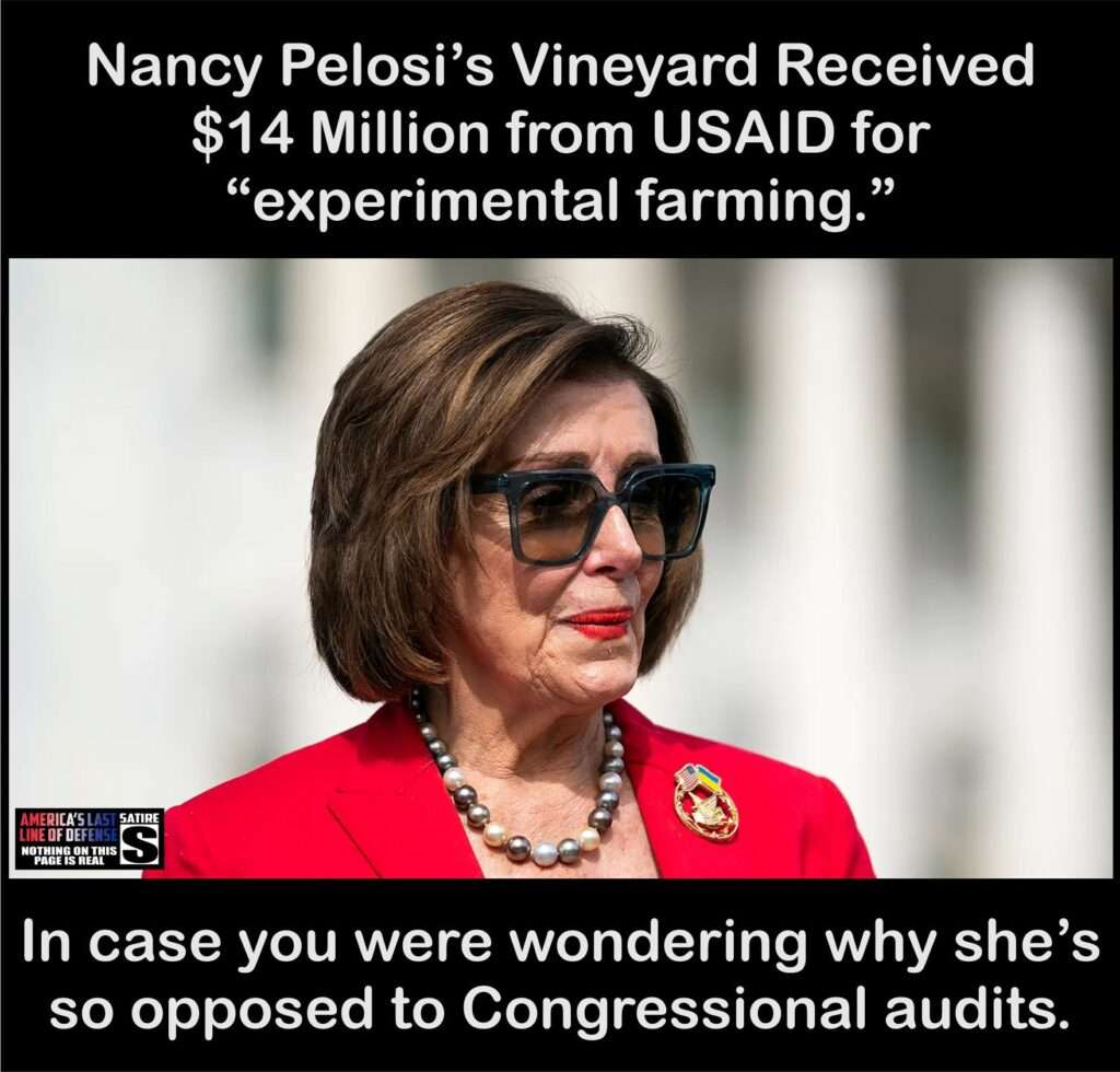 Napa Valley, CA – In what critics are calling a miraculous stroke of government generosity, former House Speaker Nancy Pelosi’s luxurious Napa Valley vineyard has reportedly secured millions in federal grants for what she describes as “experimental farming initiatives aimed at addressing climate change, sustainability, and the urgent need for wine equity.